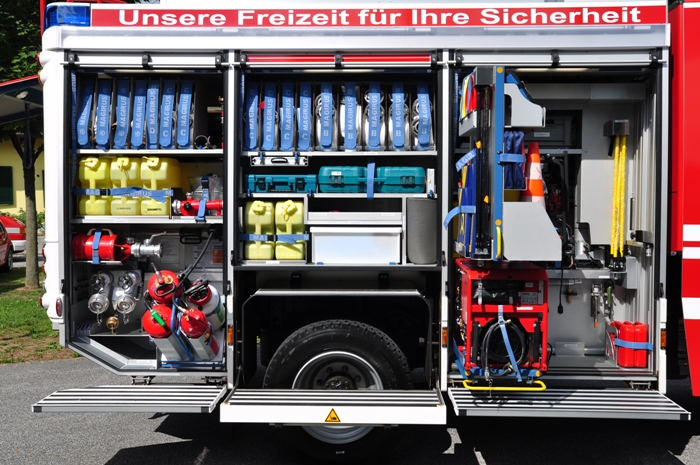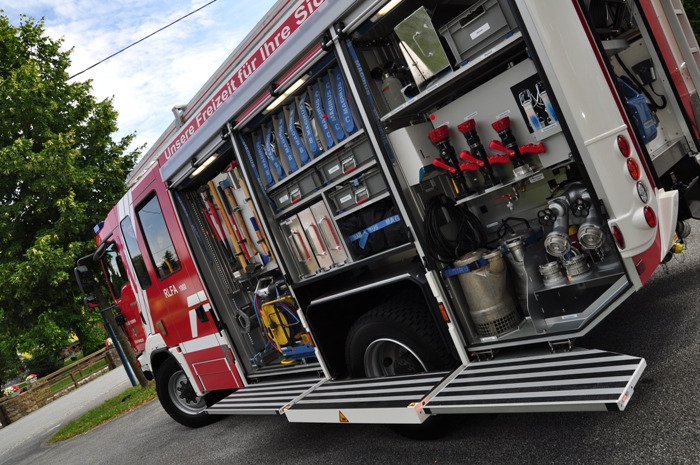 Whelen-Freedom-Ultra LED Blaulichtbalken, LED-Verkehrsleiteinrichtung, 13kVA Stromerzeuger, 5to elektr. Seilwinde, 4-teilige Steckleiter + 2 teilige Schiebeleiter, Korbtrage (incl. Abseilspinne), Spineboard, hydr. Rettungsgerät Fa. Holmatro, 3x Atemschutzgeräte, Trupp-Ausrüstung f. Menschenrettung u. Absturzsicherung, LED Wassertankanzeige links u. rechts, LED Geräteraumbeleuchtung in Aluminiumprofilen...