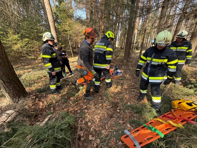 Mittels Korbtrage wurde die verunfallte Person schonend aus dem Waldstück getragen und dem Roten Kreuz zur weiteren Versorgung und zum Abtransport in ein Krankenhaus übergeben.