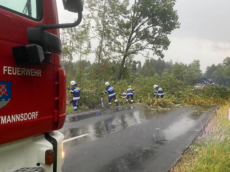 Wir wurden am 23.06.2025 nach einem heftigen Gewitter mit einigen Böen auf die L436 Richtung Sebersdorf zu mehreren umgestürzten Bäumen alarmiert.
