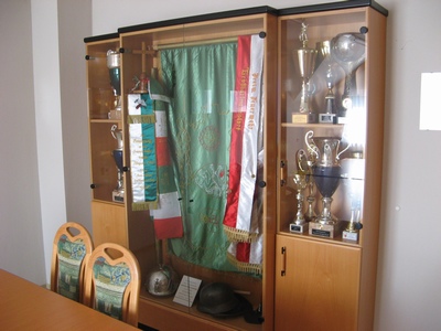 Besprechungsraum mit Fahnenschrank und Landesbewerbs-Pokale